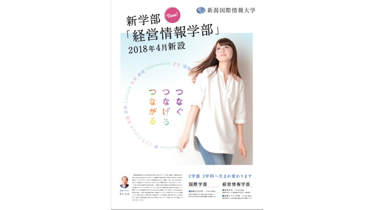 | コメント | 大きな構図で新潟と世界の街をつなぐデザインがいい。左右の小さな学生の進路企業名も精読したくなる。新聞を生かした造りだ。大学と学生による「つなぐ」「つなげる」「つながる」をのコンセプトを鮮やかに表現している。 |